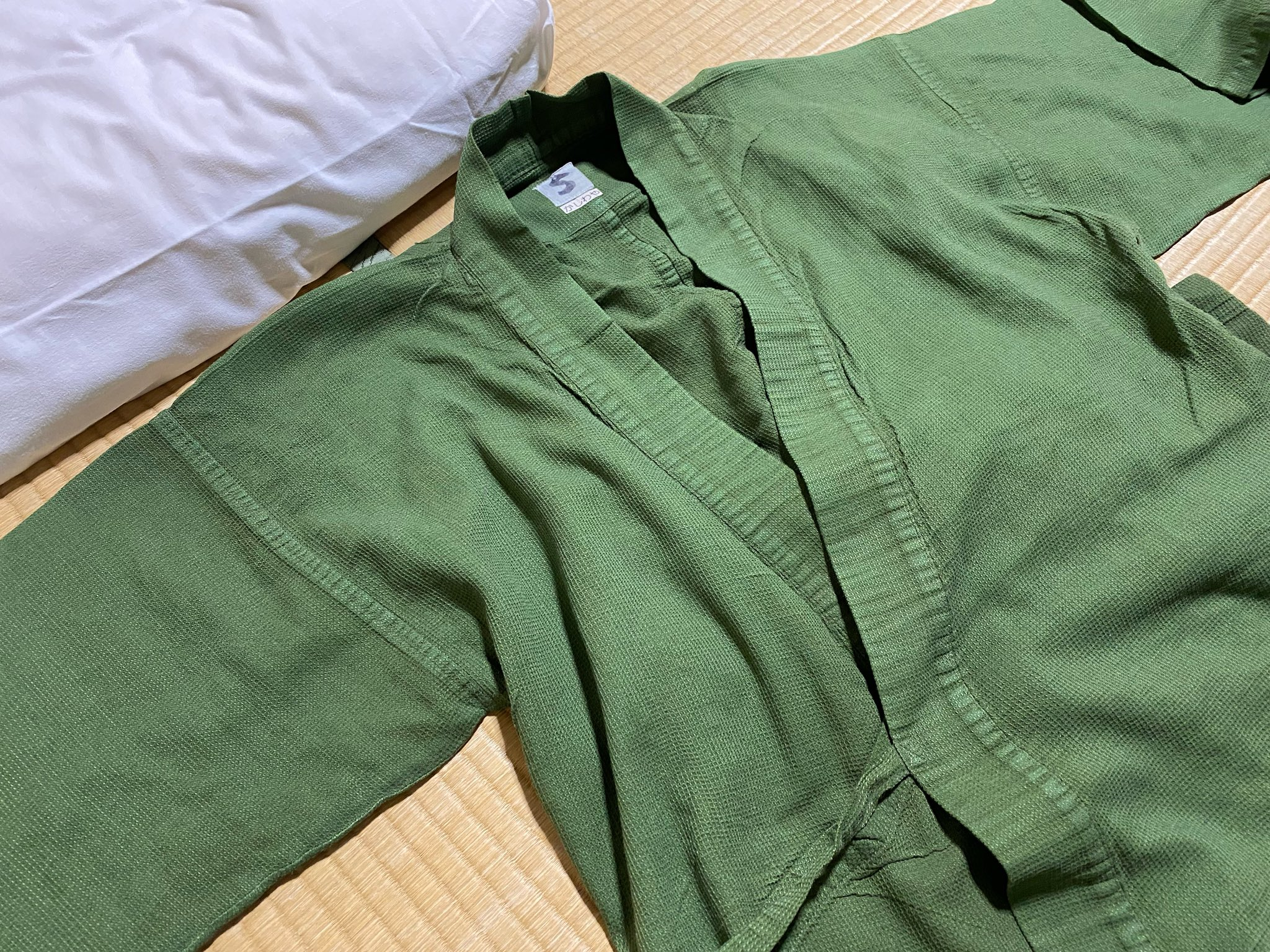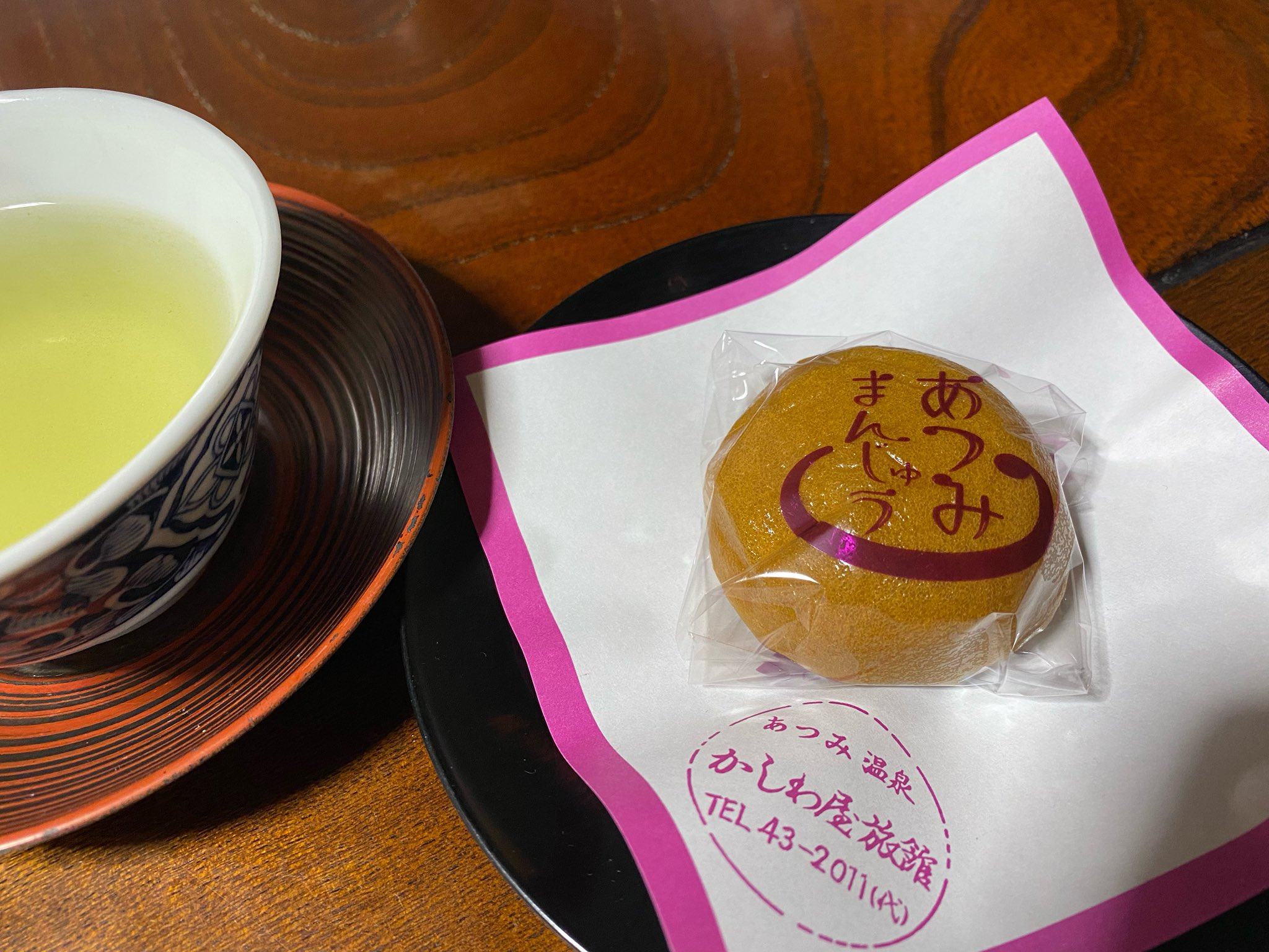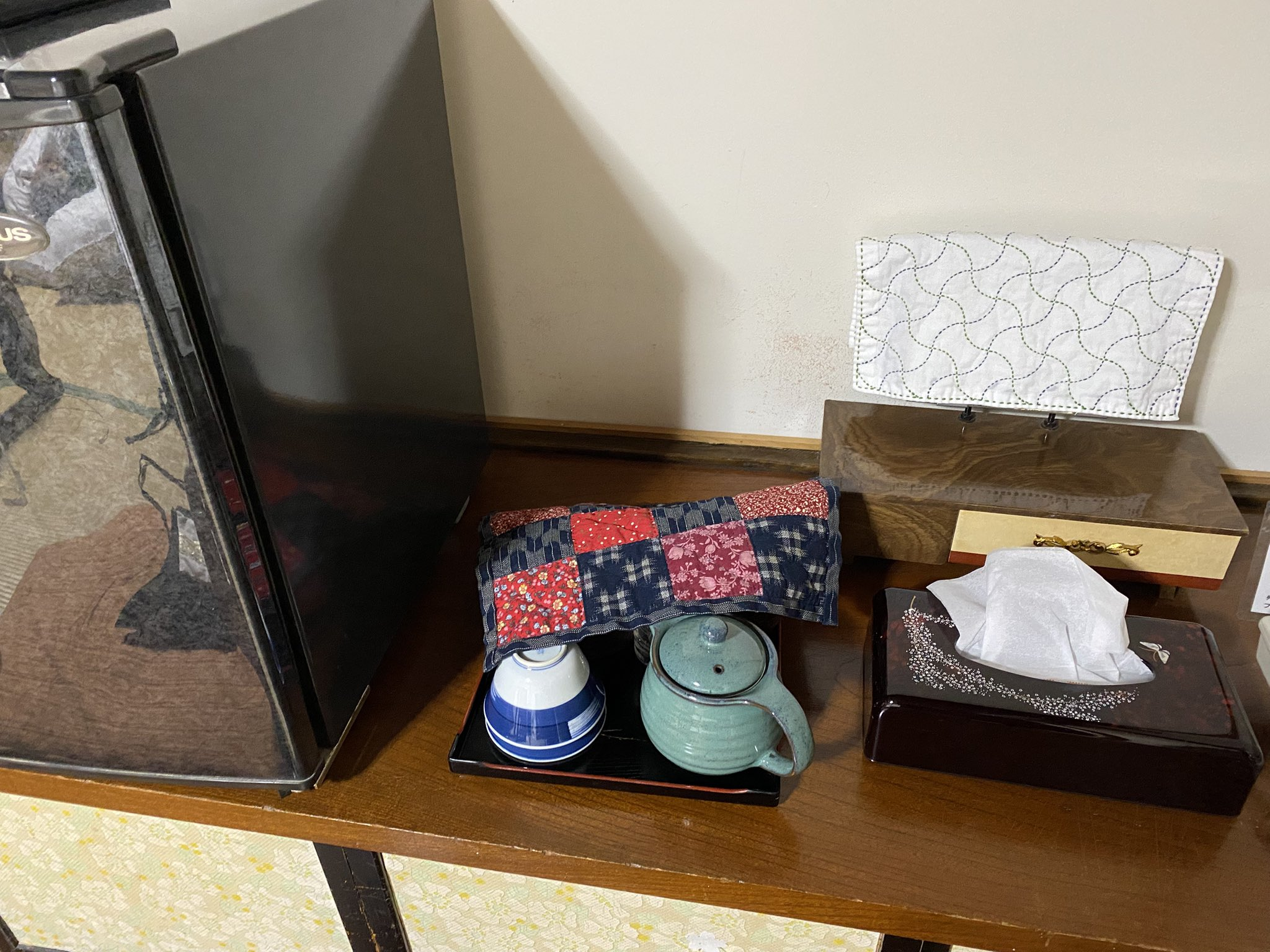部屋着は作務衣。温泉饅頭はあつみ饅頭。地元秋田の宮伝の山吹饅頭みたいでとても美味しいお饅頭でした。お茶道具には和風のパッチワーク。六畳間の奥に八畳の寝室。トイレもついて窓際には小テーブルに椅子二脚。実はその日、宿は貸切状態でした。なんてラッキーなんでしょう。