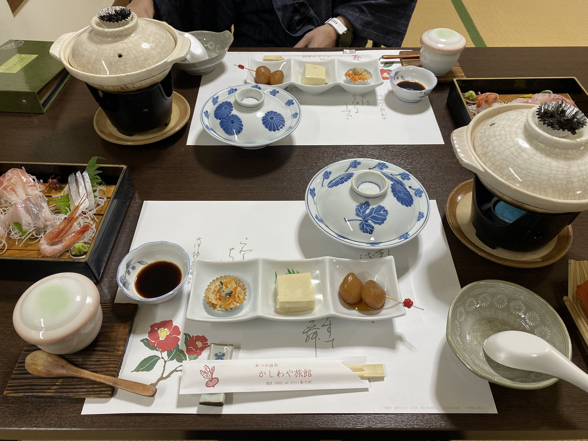 あつみ温泉かしわや旅館のお湯は源泉掛け流し、塩化物硫酸塩泉。美肌の湯とされてます。熱めのお湯が冷え切った体に染み渡ります。さて、夕飯の会場へ向かいましょう。
